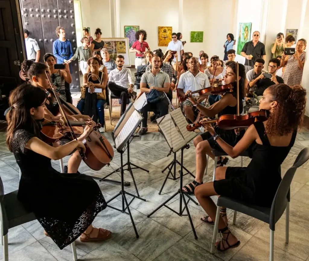 Its first study program, promoted by the FAJ, encouraged the systematic exchange with Cuban and international professors with vast experience in teaching and performing in orchestral ensembles, in order to complement the training of twelve young fretted string players, selected after an audition process.