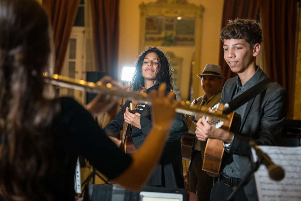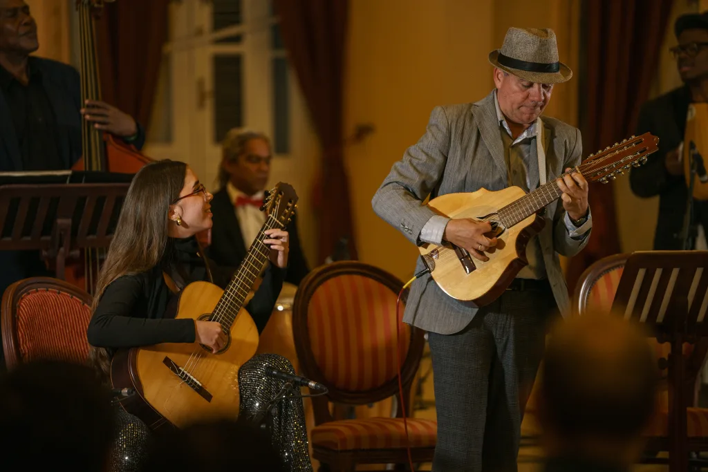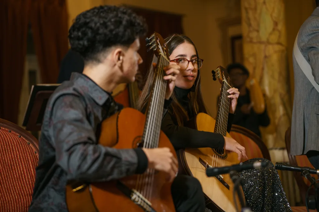 El programa avanzó alternando momentos de alta intensidad técnica con zonas de repliegue expresivo. En Alborada guajira, la interacción entre los jóvenes fue vital: los guitarristas Natalia Hernández y Armando Moreira —ambos ganadores del concurso— junto a Ihara María Rosales y José Eduardo Rodríguez en el tres, construyeron una complicidad que combinó destreza, precisión y energía, dejando en evidencia la soltura con la que Roldán enseña a sus alumnos.