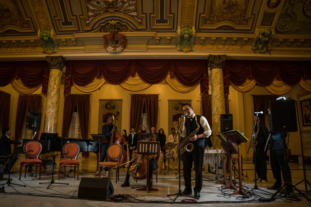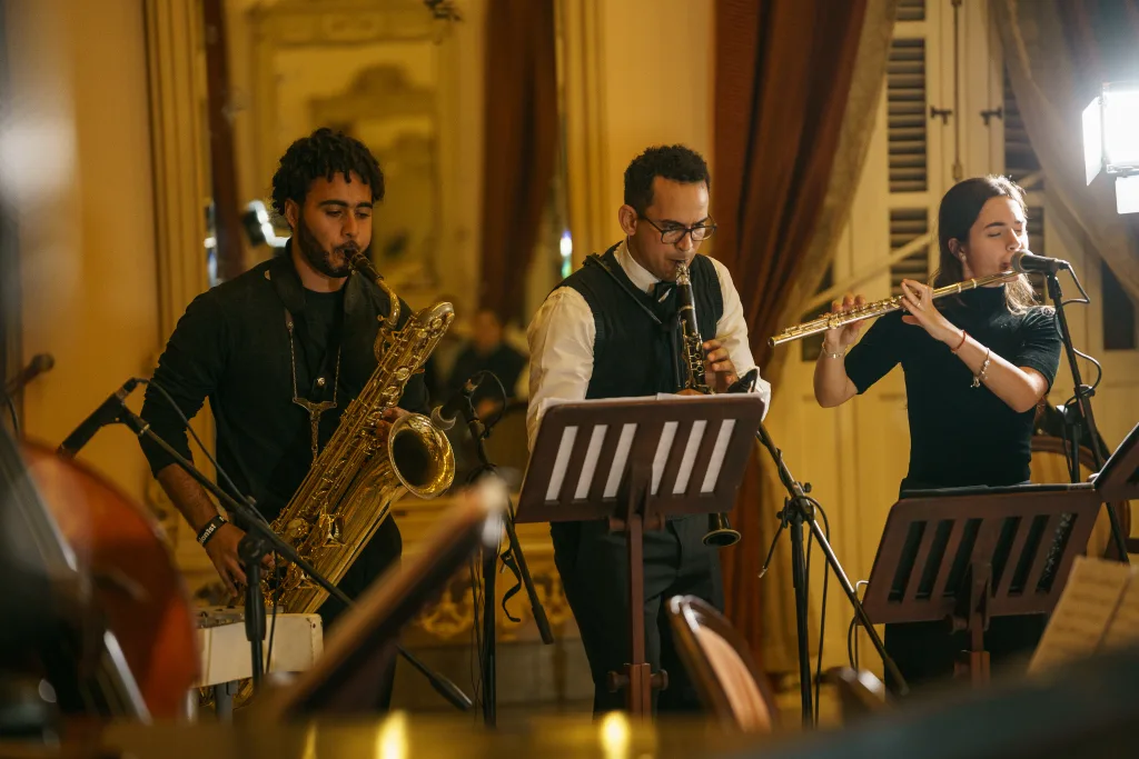 El concierto, alejado de toda rigidez historiográfica, patentó además su compromiso con el patrimonio musical cubano citando a Alberto Socarrás, quien fuera el primer músico en la historia del latin jazz en grabar un solo de flauta. De Socarrás se escucharon esa noche sus versiones de Caravan —el famoso standard compuesto en 1936 por Juan Tizol y Duke Ellington— y You and I, ambas transcritas por el propio Abreu. En Caravan, Alessa Blanco Bencomo (flauta) y Vismar Suárez (saxofón) no solo demostraron el dominio en su ejecución sino la madurez interpretativa suficiente para navegar por la arquitectura rítmico-expresiva que entraña esta obra. Mientras que el flautista Darío Cuba, con plena conciencia de su lugar en ese linaje, tocó su instrumento con la responsabilidad de sostener una tradición viva.