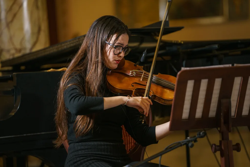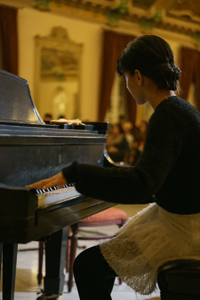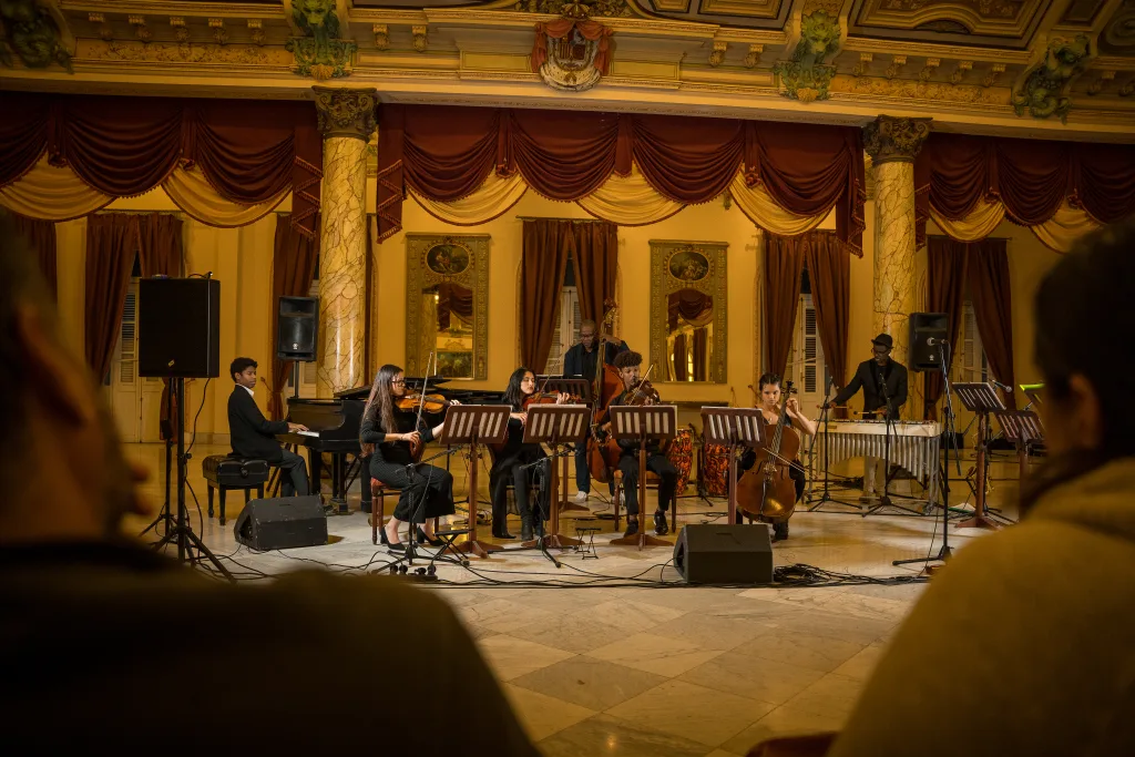 El diseño del programa, acompañado por músicos de amplia trayectoria —Roldán Carballoso en el laúd, Adel González en la percusión y Pedro Pablo Gutiérrez en el contrabajo— eludió toda lógica de acumulación para situar una dramaturgia sutil, organizada en pausas, contrastes y giros emocionales. Three for two, de James Rae, abrió el concierto como un verdadero preludio: el quinteto de cuerdas integrado por las violinistas Eva Lorena Pérez y María del Pilar Pérez, el violista José Anthoni Ortiz, la cellista y ganadora María Karla Rifat y el maestro Pedro Pablo Gutiérrez, estableció desde el inicio el clima de escucha. De esa contención inicial, Vino y bicicleta —obra de Diego Abreu, uno de los ganadores del certamen— desplegó una melodía de gran delicadeza. La pieza, sostenida por una escritura de notable madurez pianística, confirmó que en esta nueva generación la edad, lejos de parecer límite estético se impone con la naturalidad de quien piensa la música desde la experiencia.