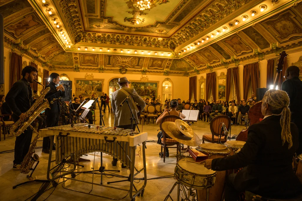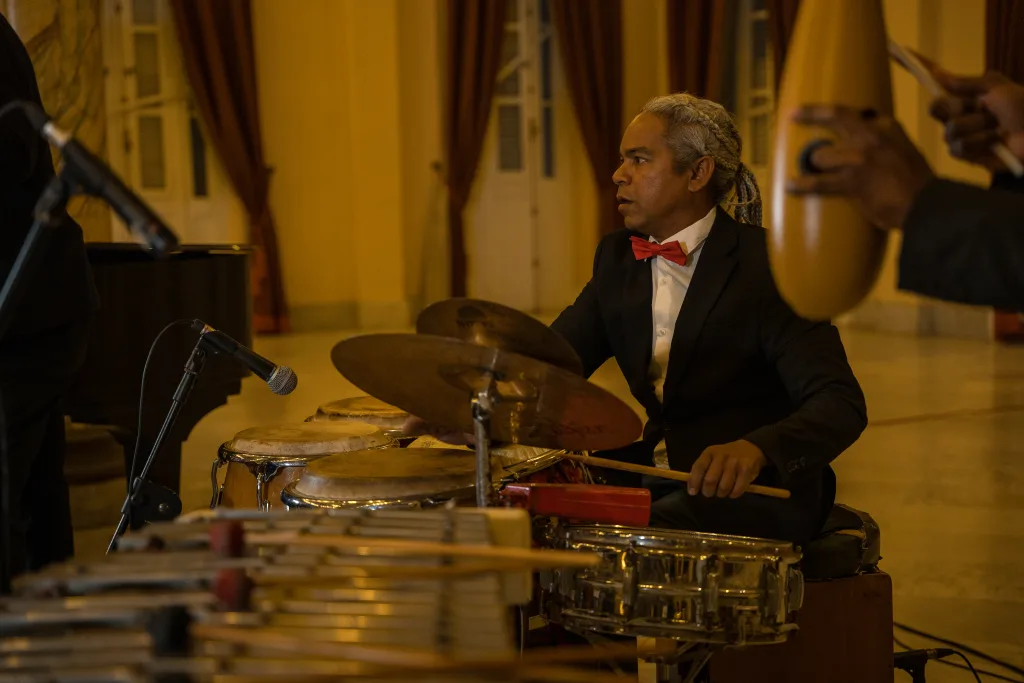 Caribeña, del pianista Alejandro Falcón, en un arreglo para cuatro manos interpretado por Esteban Hernández y Álvaro Pérez, ofreció el contraste tímbrico y expresivo. El juego de manos sobre el teclado creó texturas que dialogaban con la respiración de la audiencia y aportó un momento de cooperación entre los intérpretes. Por su parte, Puesto y convidado, para piano solo, propuso una de esas pausas necesarias que reorganizan la percepción del conjunto. La obra de Ernán López-Nussa, interpretada por Álvaro Pérez, con su lúcido guiño al imaginario del cine mudo de los años veinte, suspendió por un instante el impulso de la noche para centrar la escucha en la dimensión narrativa del instrumento.